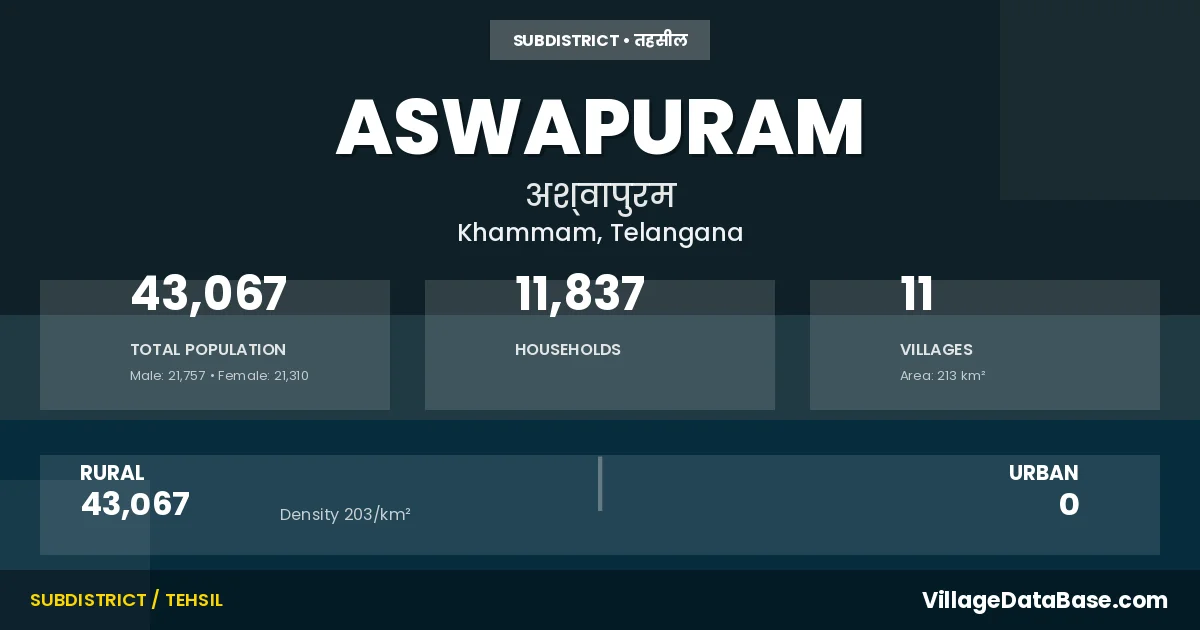 According to the 2011 census The total area of Aswapuram Mandal is 213 km², with a population of 43067 people. The population density is 203 inhabitants per square kilometre, and there are approximately 11837 houses in the sub district.