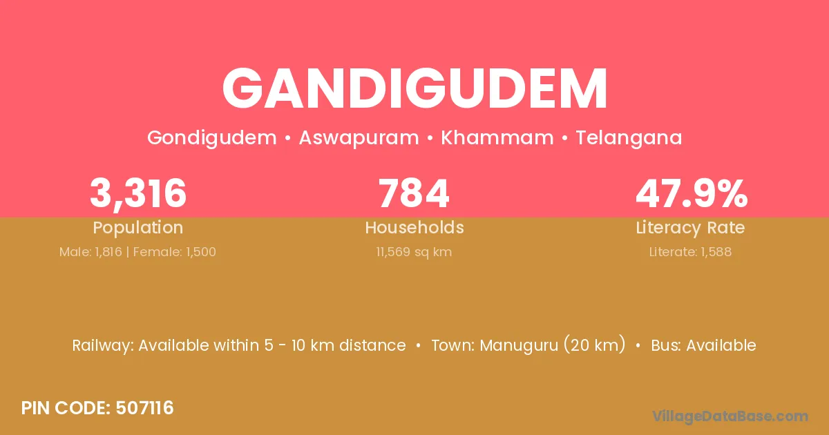 Manuguru (20 km) is the nearest town to Gandigudem village for major economic activities and is located approximately 20 km away.