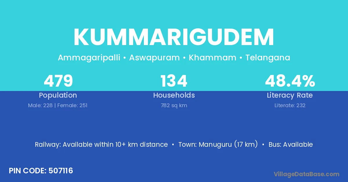 Kummarigudem village has a total population of 479 people, of which 228 are males and 251 are females.