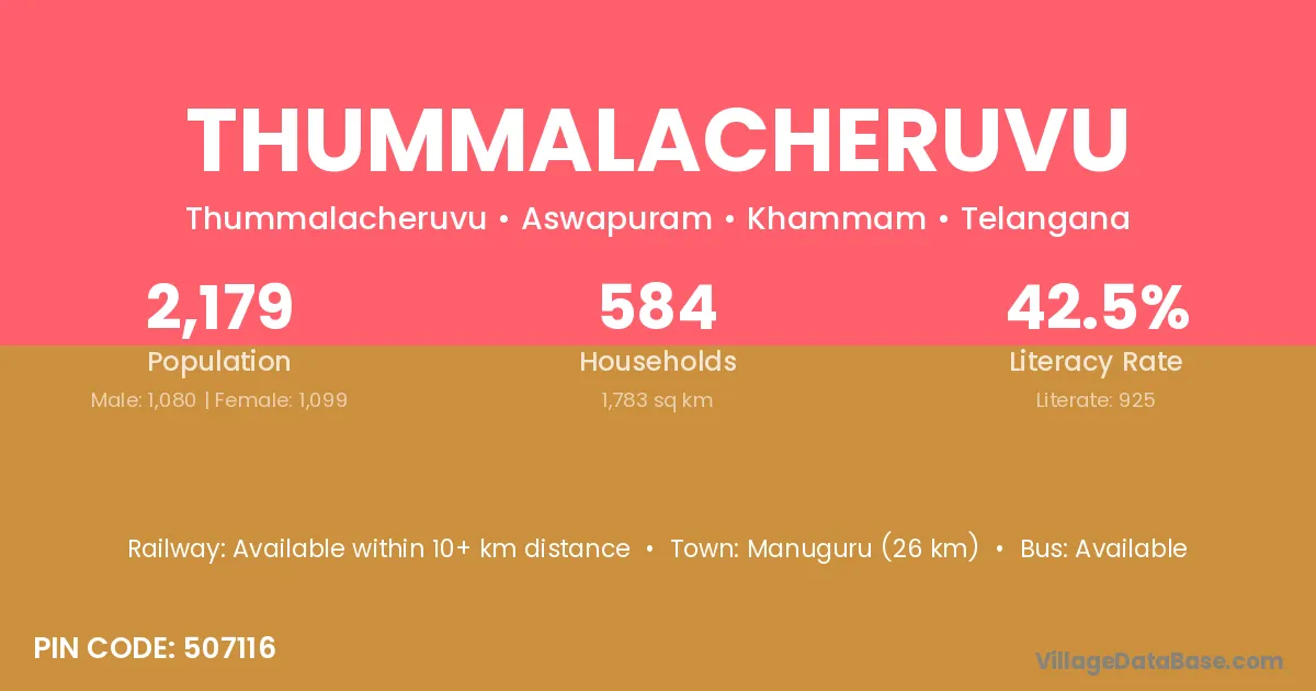 Manuguru (26 km) is the nearest town to Thummalacheruvu village for major economic activities and is located approximately 26 km away.
