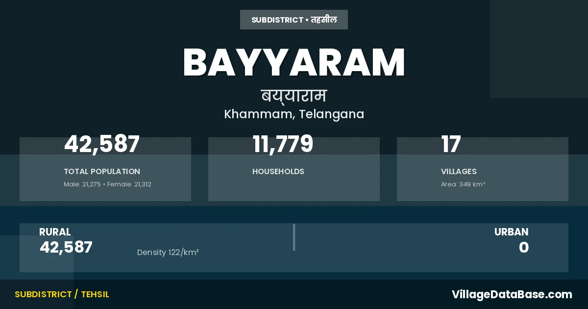 According to the 2011 census The total area of Bayyaram Mandal is 349 km², with a population of 42587 people. The population density is 122 inhabitants per square kilometre, and there are approximately 11779 houses in the sub district.