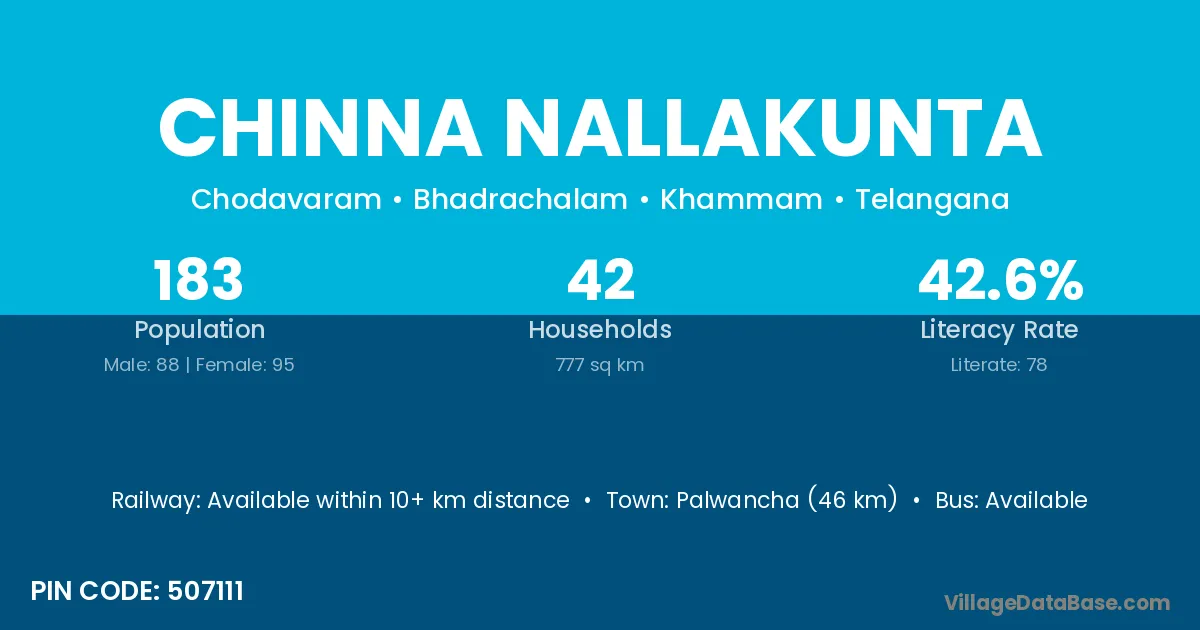Palwancha (46 km) is the nearest town to Chinna Nallakunta village for major economic activities and is located approximately 46 km away.