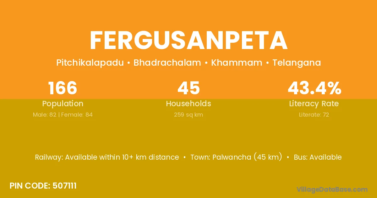 Palwancha (45 km) is the nearest town to Fergusanpeta village for major economic activities and is located approximately 45 km away.