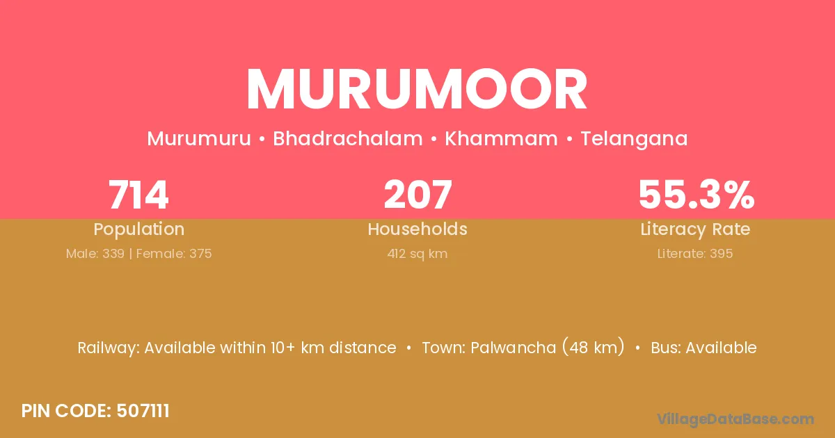 Palwancha (48 km) is the nearest town to Murumoor village for major economic activities and is located approximately 48 km away.