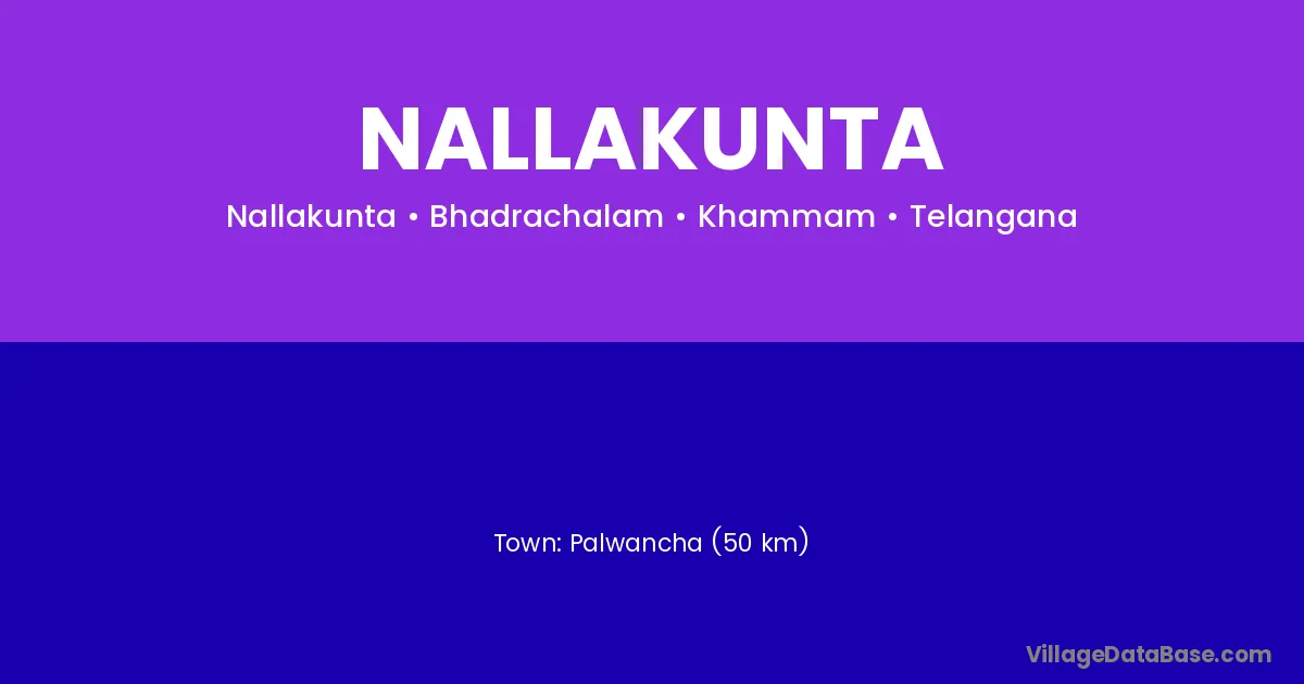 Palwancha (50 km) is the nearest town to Nallakunta village for major economic activities and is located approximately 50 km away.