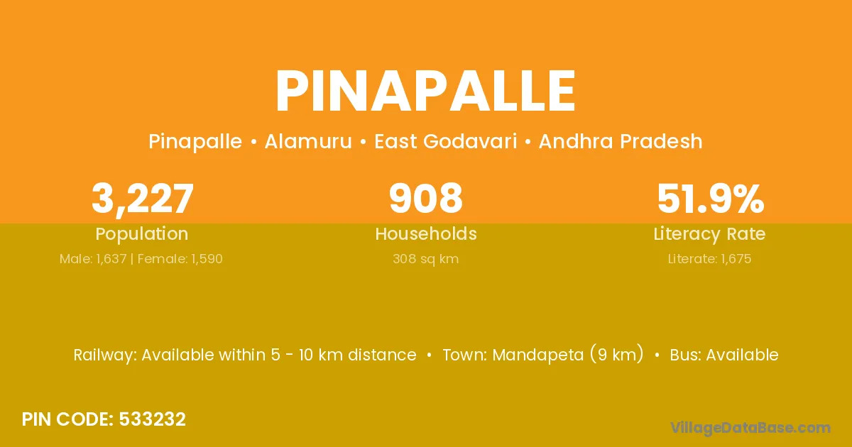 Palwancha (40 km) is the nearest town to Pinapalle village for major economic activities and is located approximately 40 km away.
