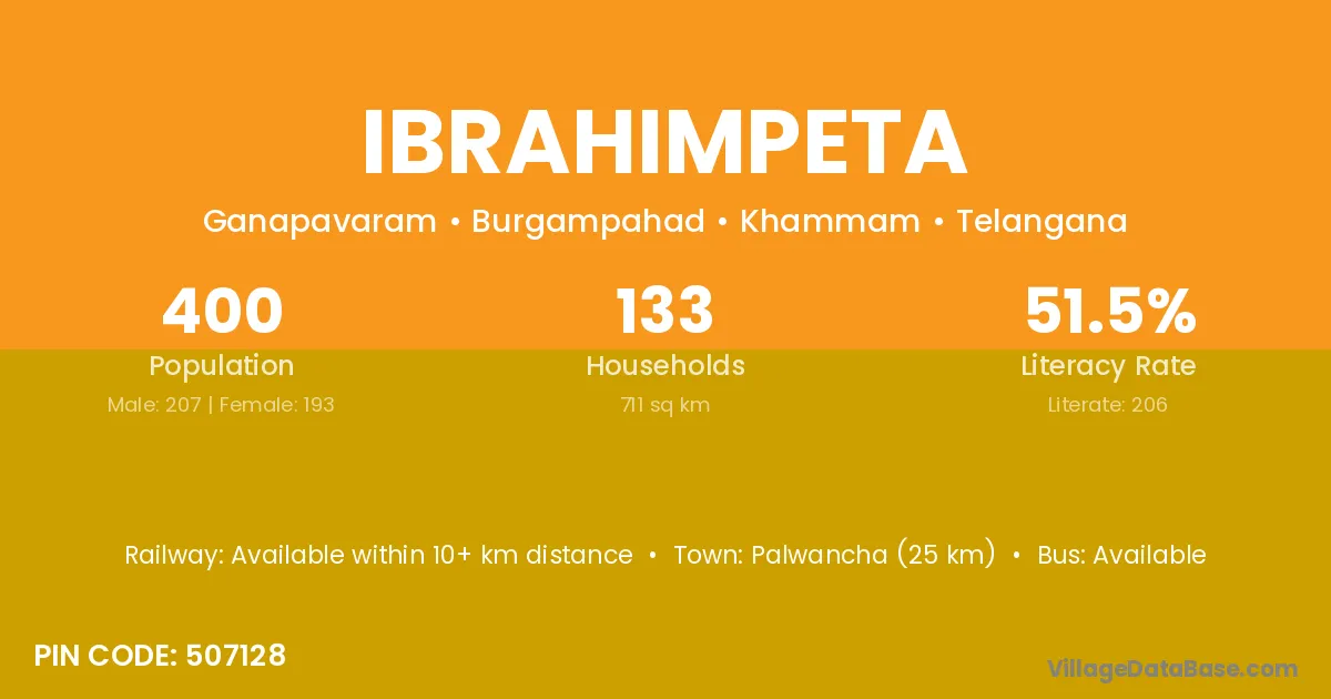 Palwancha (25 km) is the nearest town to Ibrahimpeta village for major economic activities and is located approximately 25 km away.