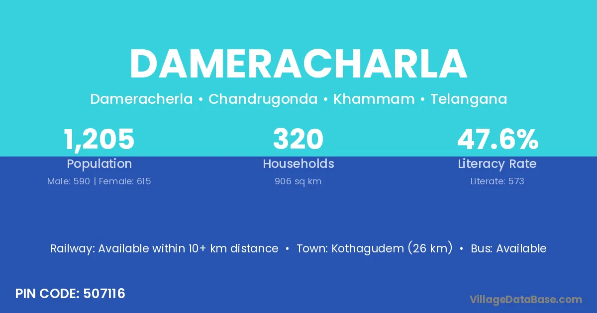 Kothagudem (26 km) is the nearest town to Dameracharla village for major economic activities and is located approximately 26 km away.