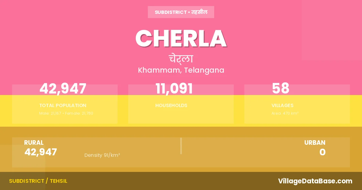 According to the 2011 census The total area of Cherla Mandal is 470 km², with a population of 42947 people. The population density is 91 inhabitants per square kilometre, and there are approximately 11091 houses in the sub district.