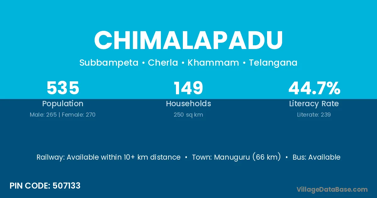 Manuguru (66 km) is the nearest town to Chimalapadu village for major economic activities and is located approximately 66 km away.