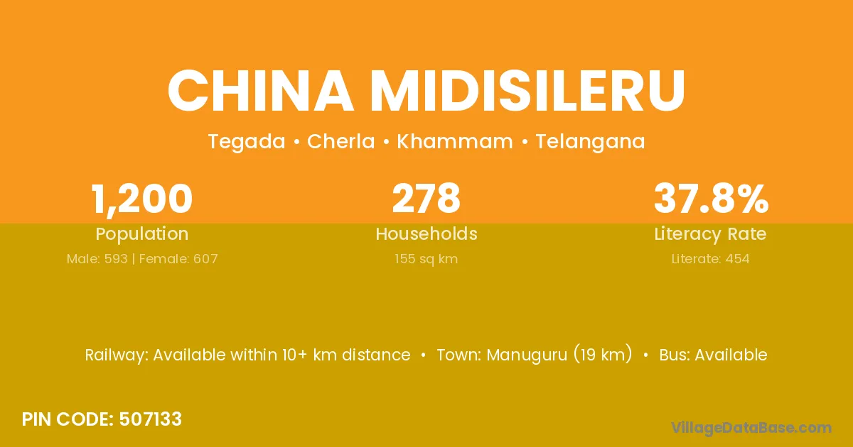Manuguru (19 km) is the nearest town to China Midisileru village for major economic activities and is located approximately 19 km away.
