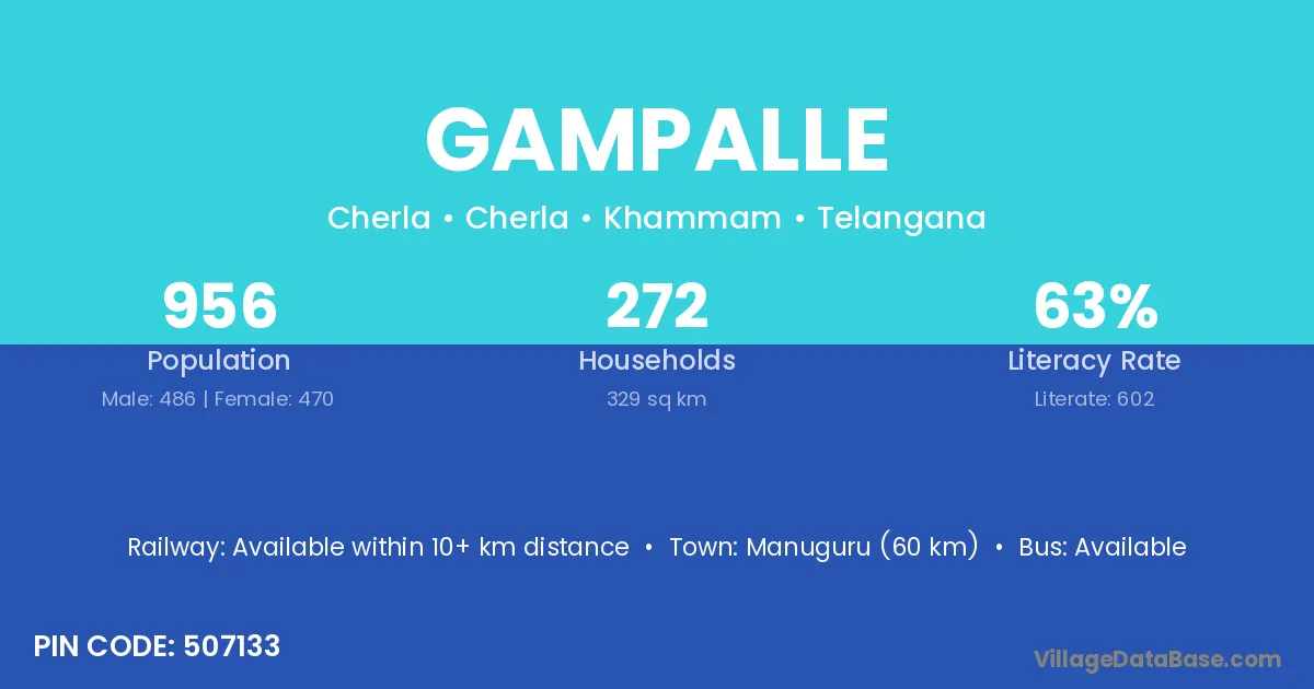 Manuguru (60 km) is the nearest town to Gampalle village for major economic activities and is located approximately 60 km away.