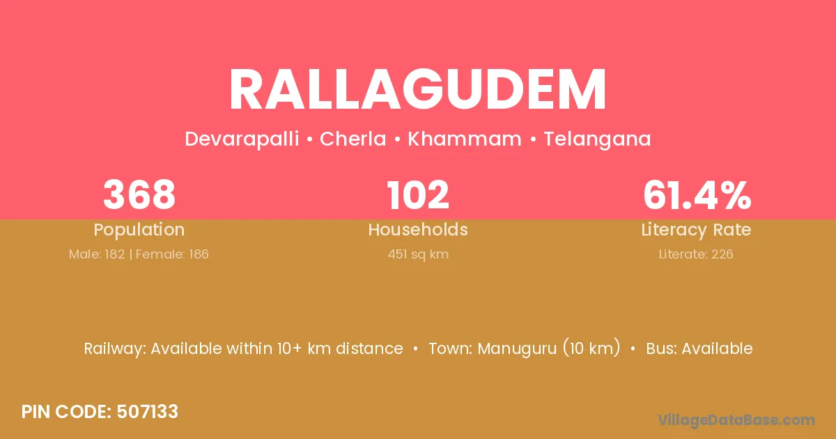 Rallagudem village has a total population of 368 people, of which 182 are males and 186 are females.