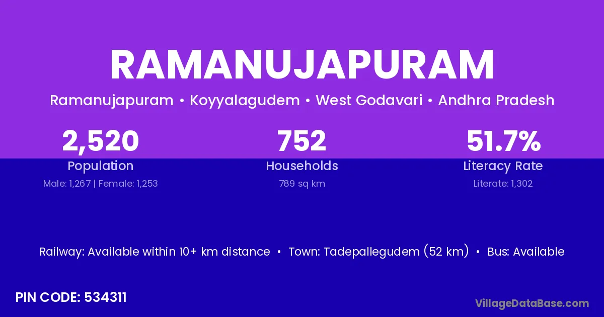 Manuguru (66 km) is the nearest town to Ramanujapuram village for major economic activities and is located approximately 66 km away.