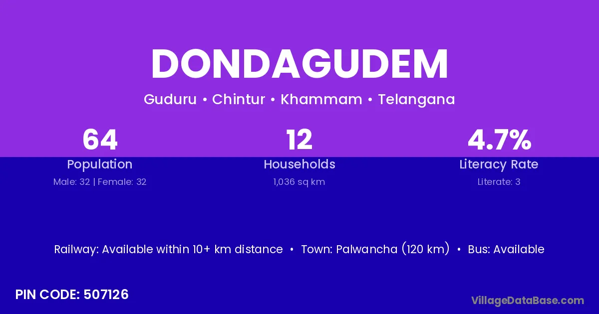 Palwancha (120 km) is the nearest town to Dondagudem village for major economic activities and is located approximately 120 km away.