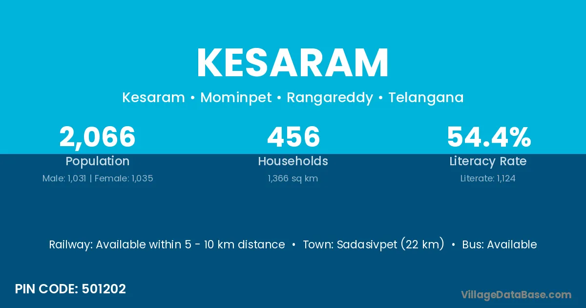 Palwancha (120 km) is the nearest town to Kesaram village for major economic activities and is located approximately 120 km away.