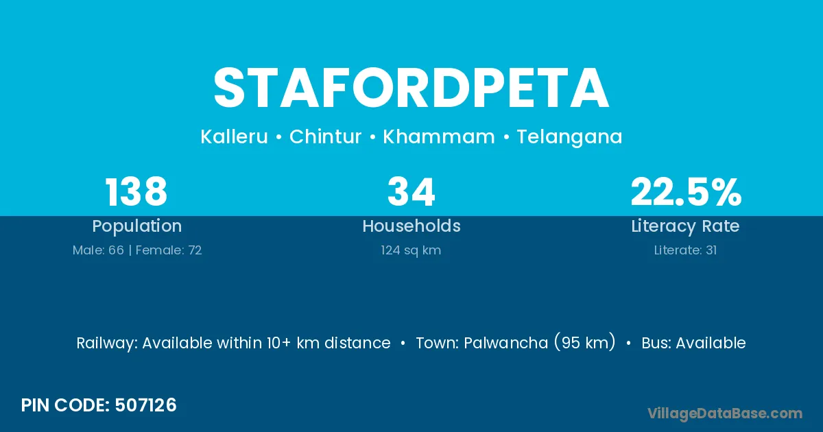 Palwancha (95 km) is the nearest town to Stafordpeta village for major economic activities and is located approximately 95 km away.