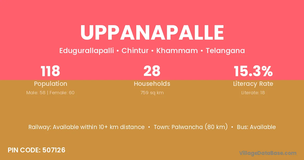 Palwancha (80 km) is the nearest town to Uppanapalle village for major economic activities and is located approximately 80 km away.