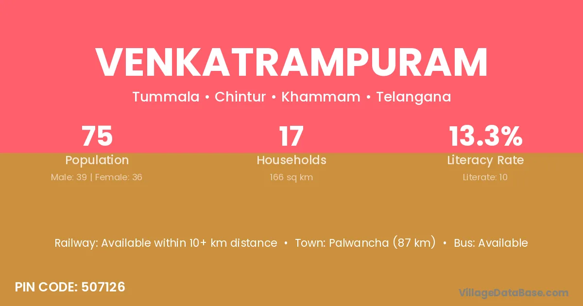 Palwancha (87 km) is the nearest town to Venkatrampuram village for major economic activities and is located approximately 87 km away.