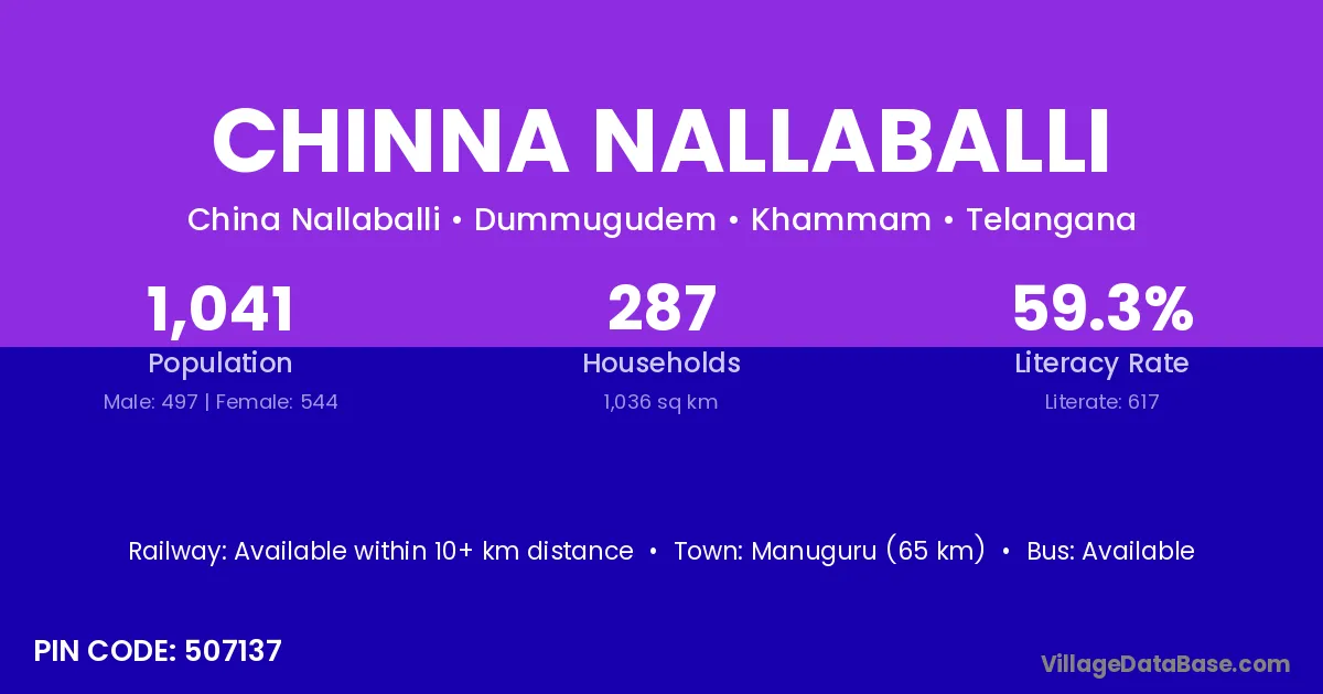 Manuguru (65 km) is the nearest town to Chinna Nallaballi village for major economic activities and is located approximately 65 km away.