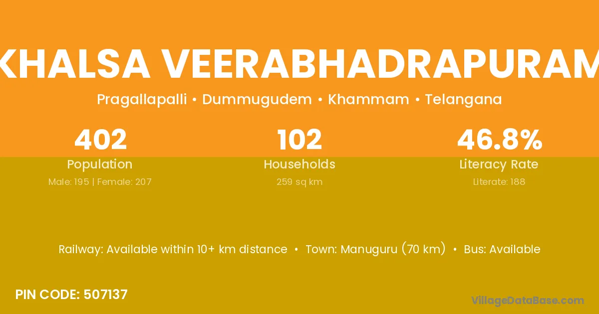 Manuguru (70 km) is the nearest town to Khalsa Veerabhadrapuram village for major economic activities and is located approximately 70 km away.