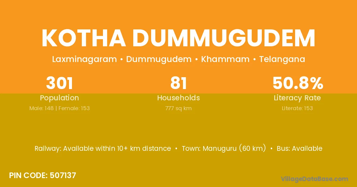 Kotha Dummugudem village has a total population of 301 people, of which 148 are males and 153 are females.