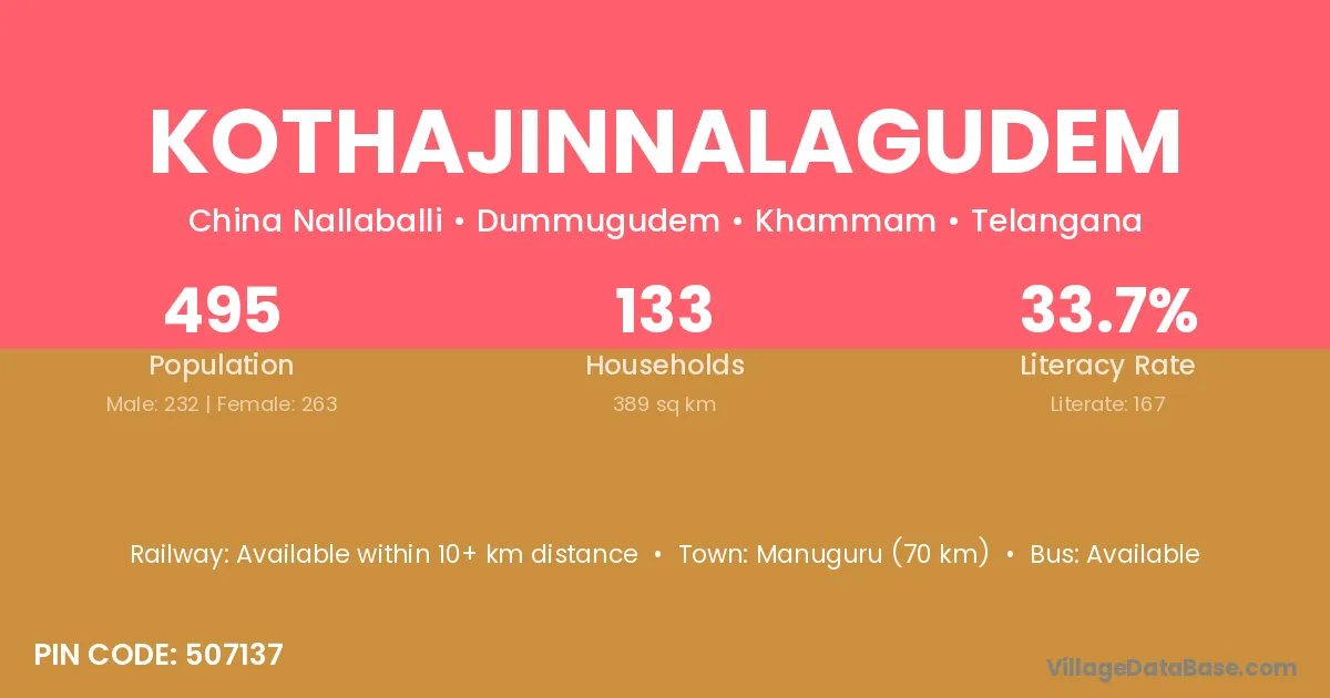Kothajinnalagudem village has a total population of 495 people, of which 232 are males and 263 are females.