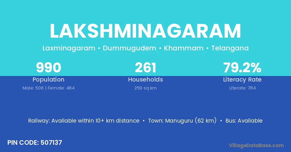 Manuguru (62 km) is the nearest town to Lakshminagaram village for major economic activities and is located approximately 62 km away.