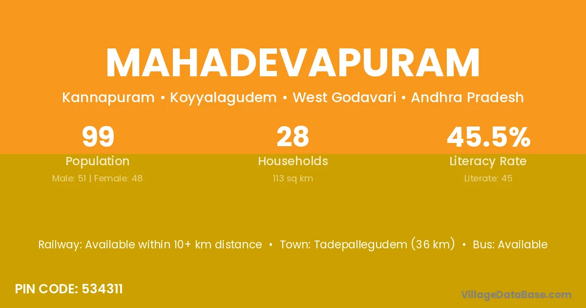 Manuguru (67 km) is the nearest town to Mahadevapuram village for major economic activities and is located approximately 67 km away.