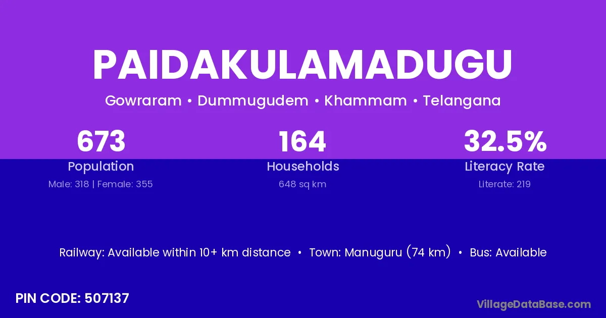 Manuguru (74 km) is the nearest town to Paidakulamadugu village for major economic activities and is located approximately 74 km away.