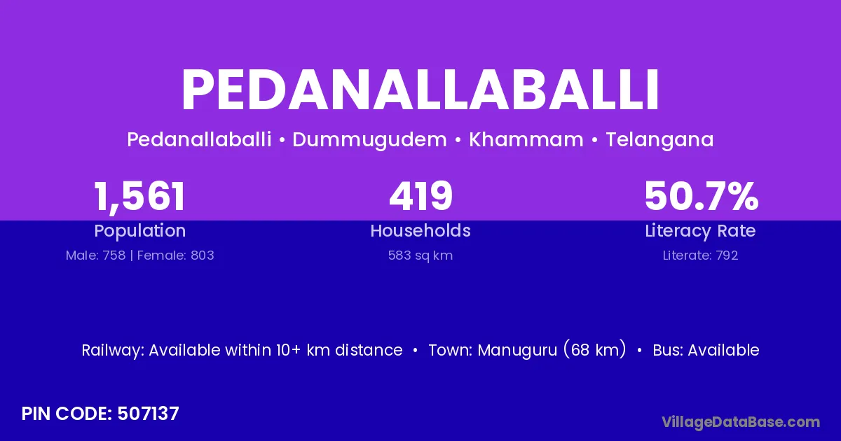 Manuguru (68 km) is the nearest town to Pedanallaballi village for major economic activities and is located approximately 68 km away.
