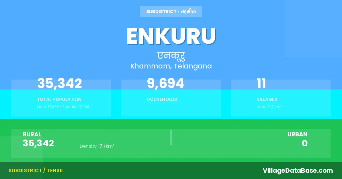 Enkuru is a town and Mandal in the Khammam district of the Telangana. In India, a Mandal is a subdivision of a district responsible for the administration and revenue collection of a specific area within the district. Mandals play a crucial role in the local governance structure, contributing significantly to the development and administration of their communities.