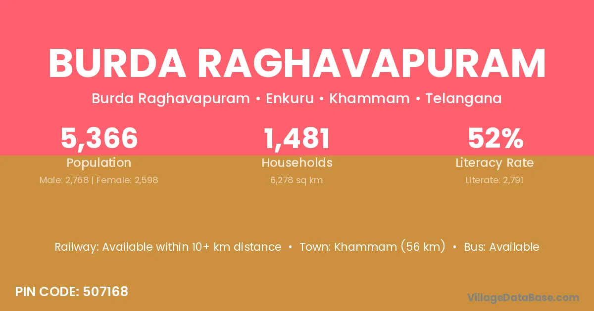 Khammam (56 km) is the nearest town to Burda Raghavapuram village for major economic activities and is located approximately 56 km away.