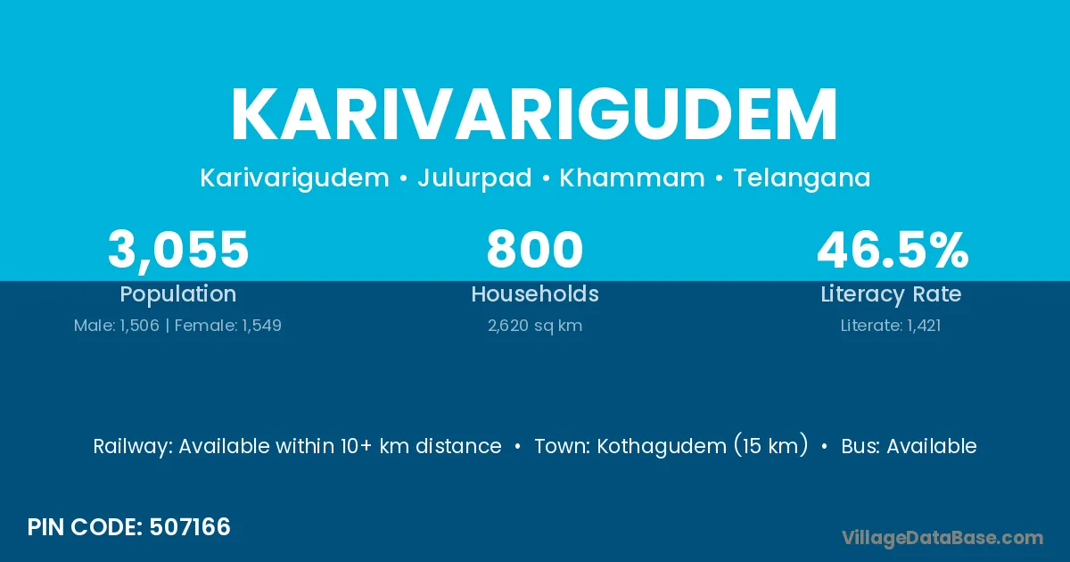 Kothagudem (15 km) is the nearest town to Karivarigudem village for major economic activities and is located approximately 15 km away.