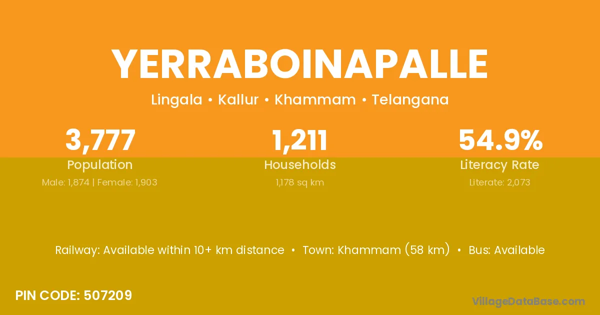 Khammam (58 km) is the nearest town to Yerraboinapalle village for major economic activities and is located approximately 58 km away.