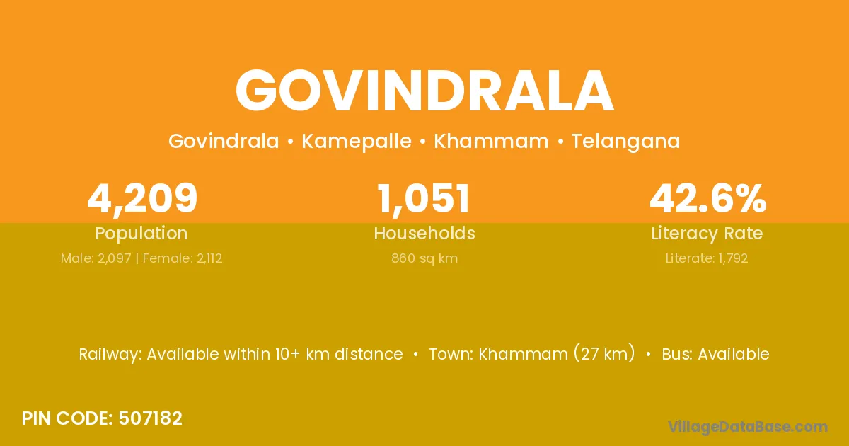 Khammam (27 km) is the nearest town to Govindrala village for major economic activities and is located approximately 27 km away.