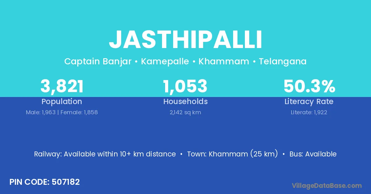 Jasthipalli village has a total population of 3,821 people, of which 1,963 are males and 1,858 are females.