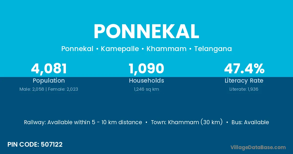 Khammam (30 km) is the nearest town to Ponnekal village for major economic activities and is located approximately 30 km away.