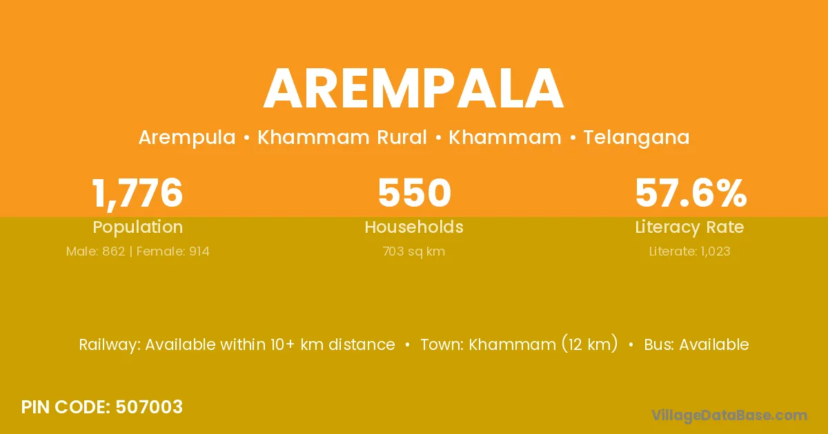 Khammam (12 km) is the nearest town to Arempala village for major economic activities and is located approximately 12 km away.