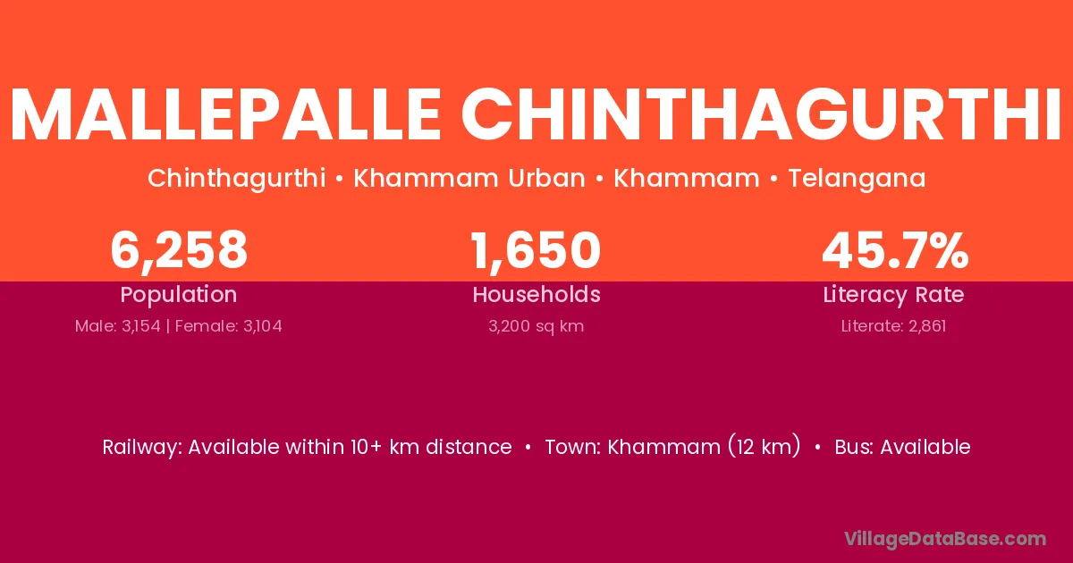Mallepalle Chinthagurthi village has a total population of 6,258 people, of which 3,154 are males and 3,104 are females.