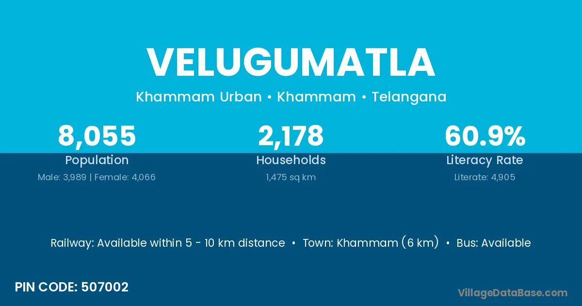 Khammam (6 km) is the nearest town to Velugumatla village for major economic activities and is located approximately 6 km away.
