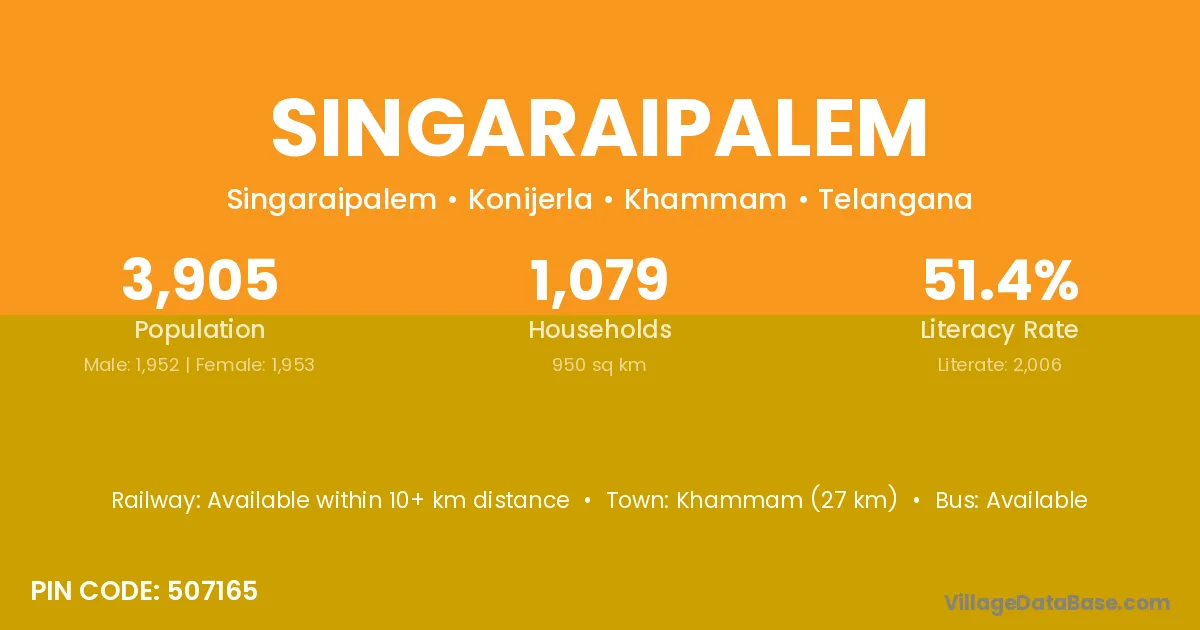 Khammam (27 km) is the nearest town to Singaraipalem village for major economic activities and is located approximately 27 km away.