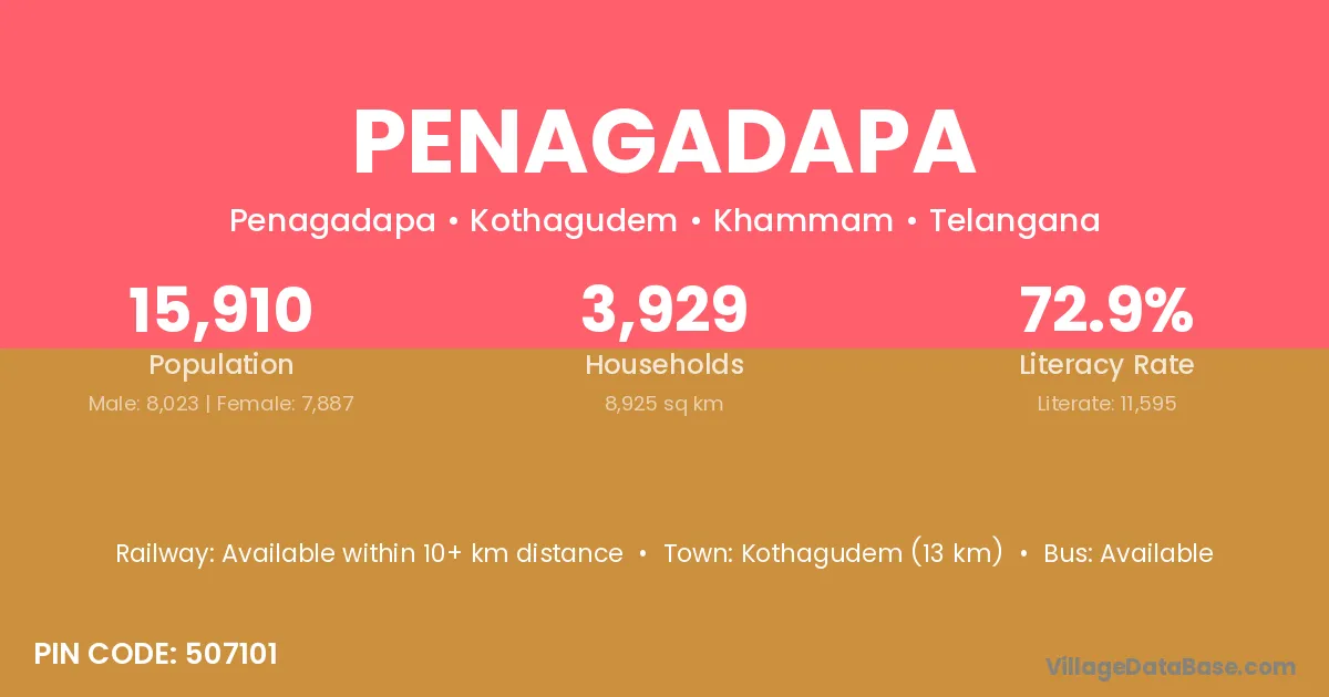 Kothagudem (13 km) is the nearest town to Penagadapa village for major economic activities and is located approximately 13 km away.