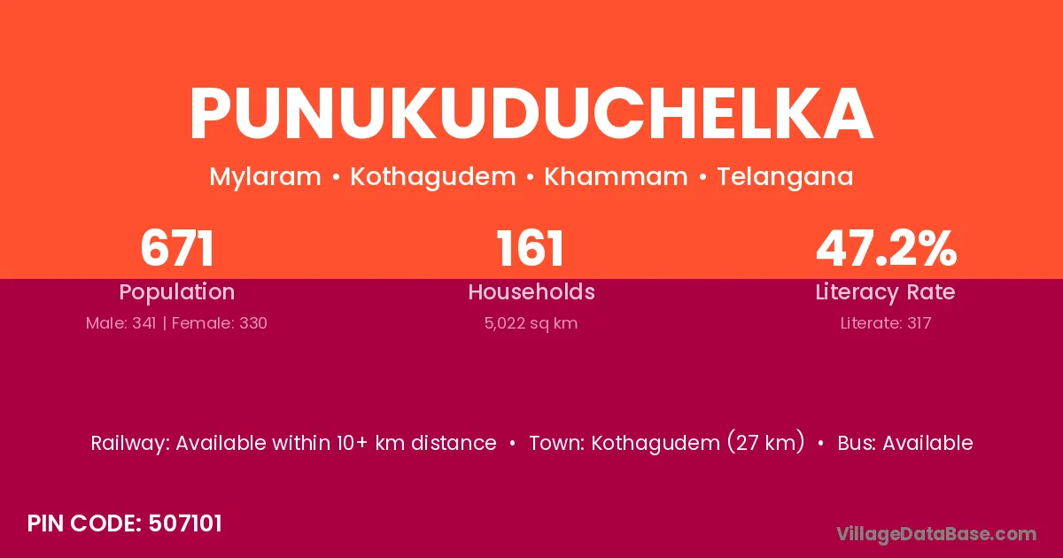 Kothagudem (27 km) is the nearest town to Punukuduchelka village for major economic activities and is located approximately 27 km away.