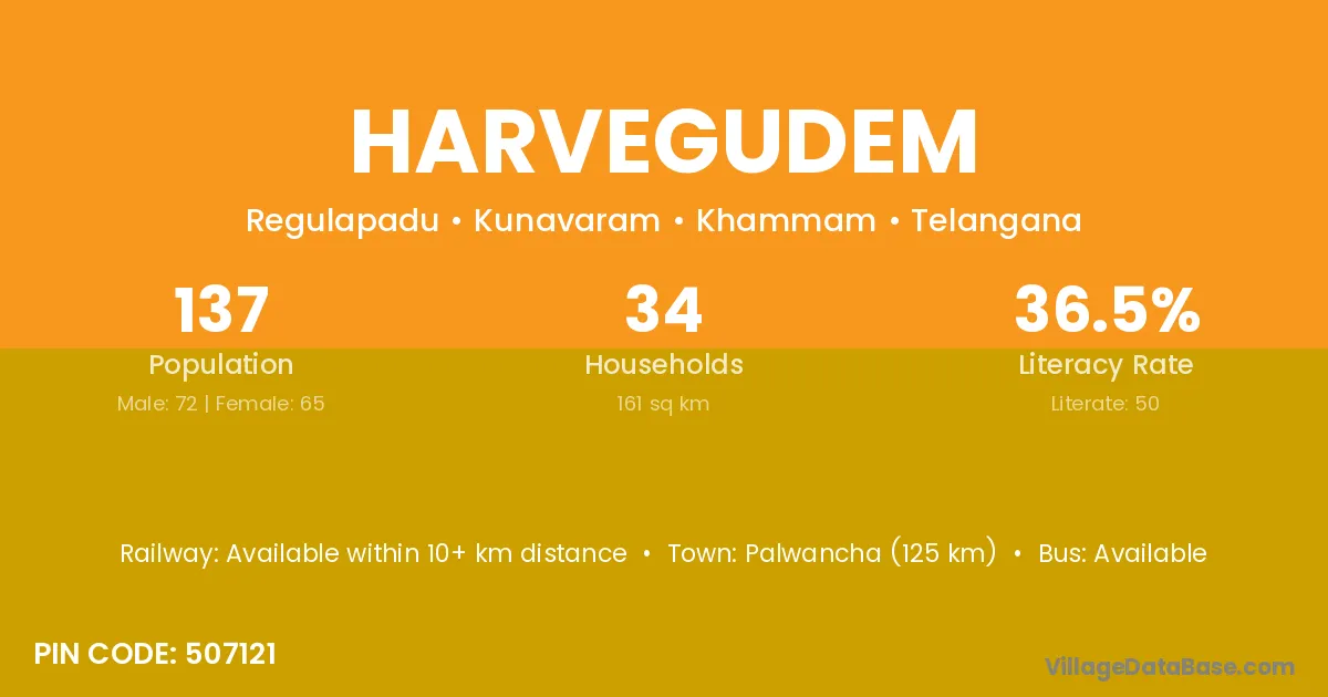 Palwancha (125 km) is the nearest town to Harvegudem village for major economic activities and is located approximately 125 km away.