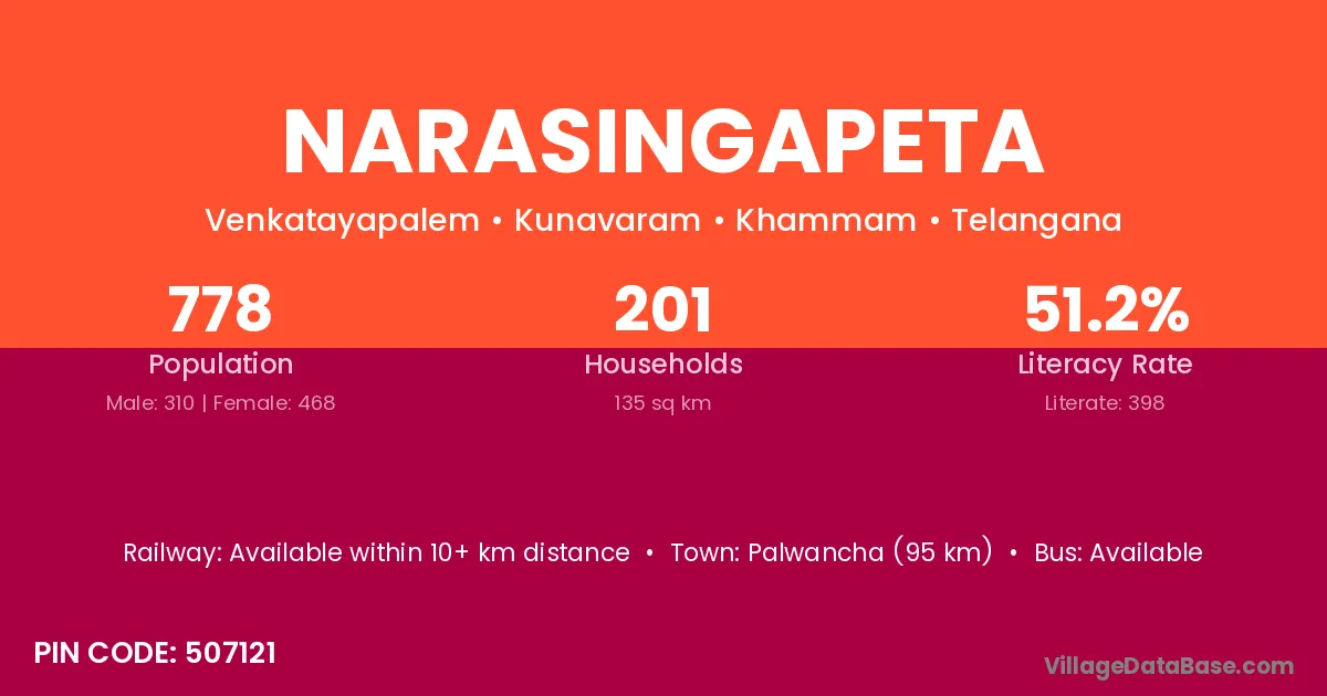 Palwancha (95 km) is the nearest town to Narasingapeta village for major economic activities and is located approximately 95 km away.