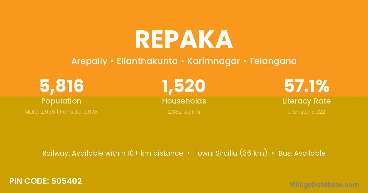 Palwancha (90 km) is the nearest town to Repaka village for major economic activities and is located approximately 90 km away.