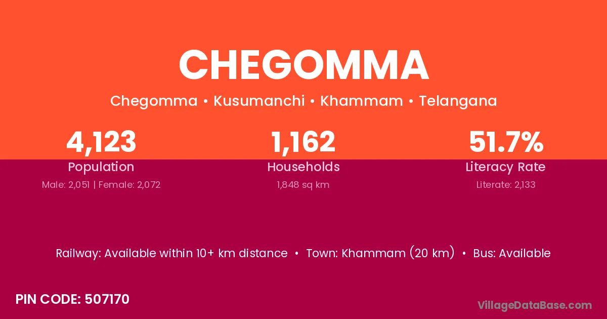 Khammam (20 km) is the nearest town to Chegomma village for major economic activities and is located approximately 20 km away.