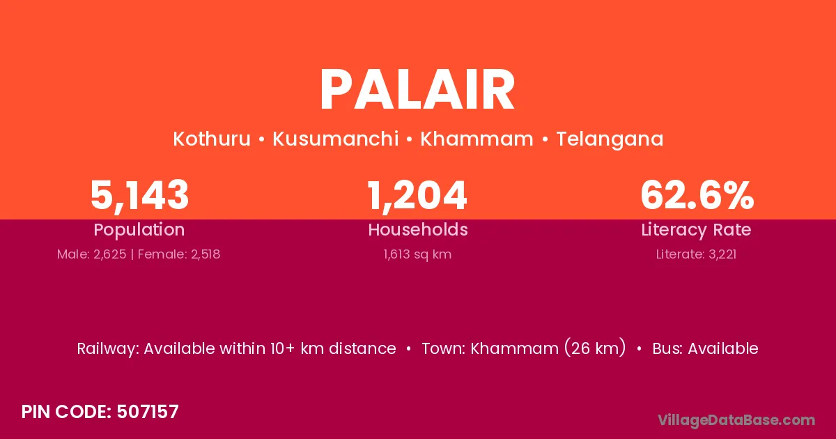 Khammam (26 km) is the nearest town to Palair village for major economic activities and is located approximately 26 km away.