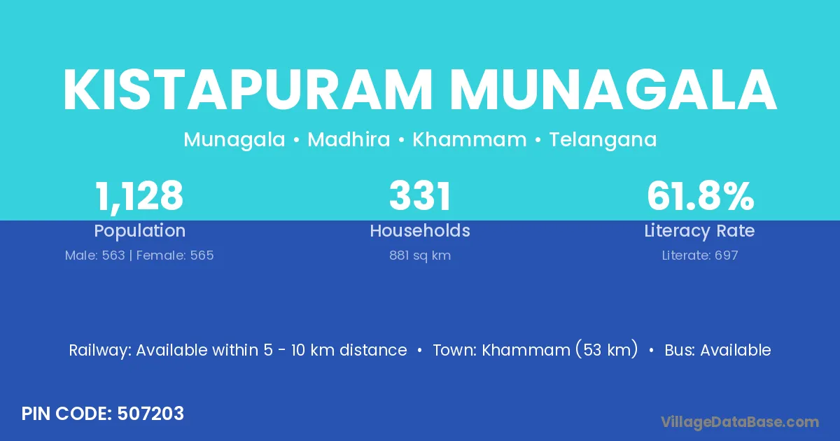 Khammam (53 km) is the nearest town to Kistapuram Munagala village for major economic activities and is located approximately 53 km away.